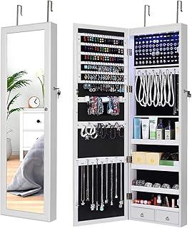 DECOMIL 6 LED ミラー ジュエリーキャビネット ロック可能 壁/ドアマウント ジュエリーアーマーオーガナイザー ミラー付き ホワイト