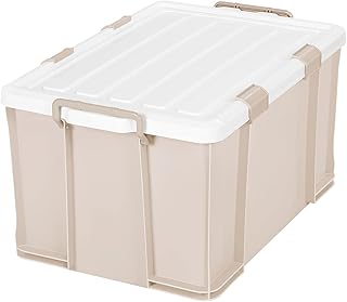 防水プラスチック収納ボックス 90QT/85L 積み重ね可能なラッチボックス 丈夫な多目的ロックビン 蓋とブラッククリップ付き 寝具、おもちゃ、靴、衣類用 (カーキ) 3個パック